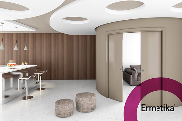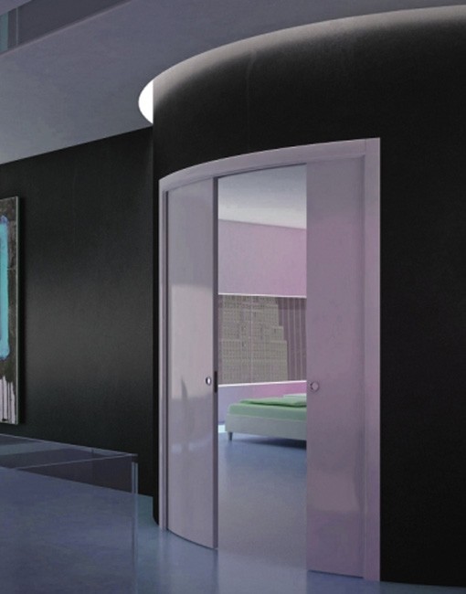 מערכת הזזה לכיס דו כנפית ברדיוס לפי בחירה, תואמת קיר עגול, כוללת שתי כנפיים עגולות. גימור צביעה בתנור גוון לפי בחירה מכל מניפות הצבעים עד 100% ברק / גמר פורניר.