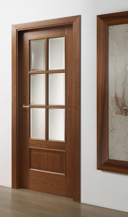 מזוגג 6 חלונות – זכוכית חלבית/שקופה טריפלקס 6 מ"מ, שטוף קאנט, בעלת קנט עץ מהגוני תואם והלבשה מעץ רב שכבתי.